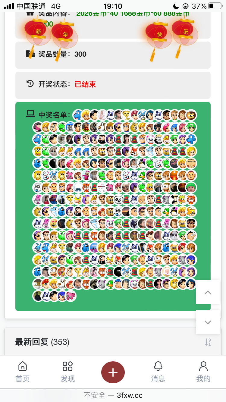 353个人300个有,都没中到,评论100名送金币都到了就我没到,胜天平均有奖,两个月评论都不送,那么多坛子都领了红利,就这里一毛不拔一分没领到。算了,换地方打业绩了