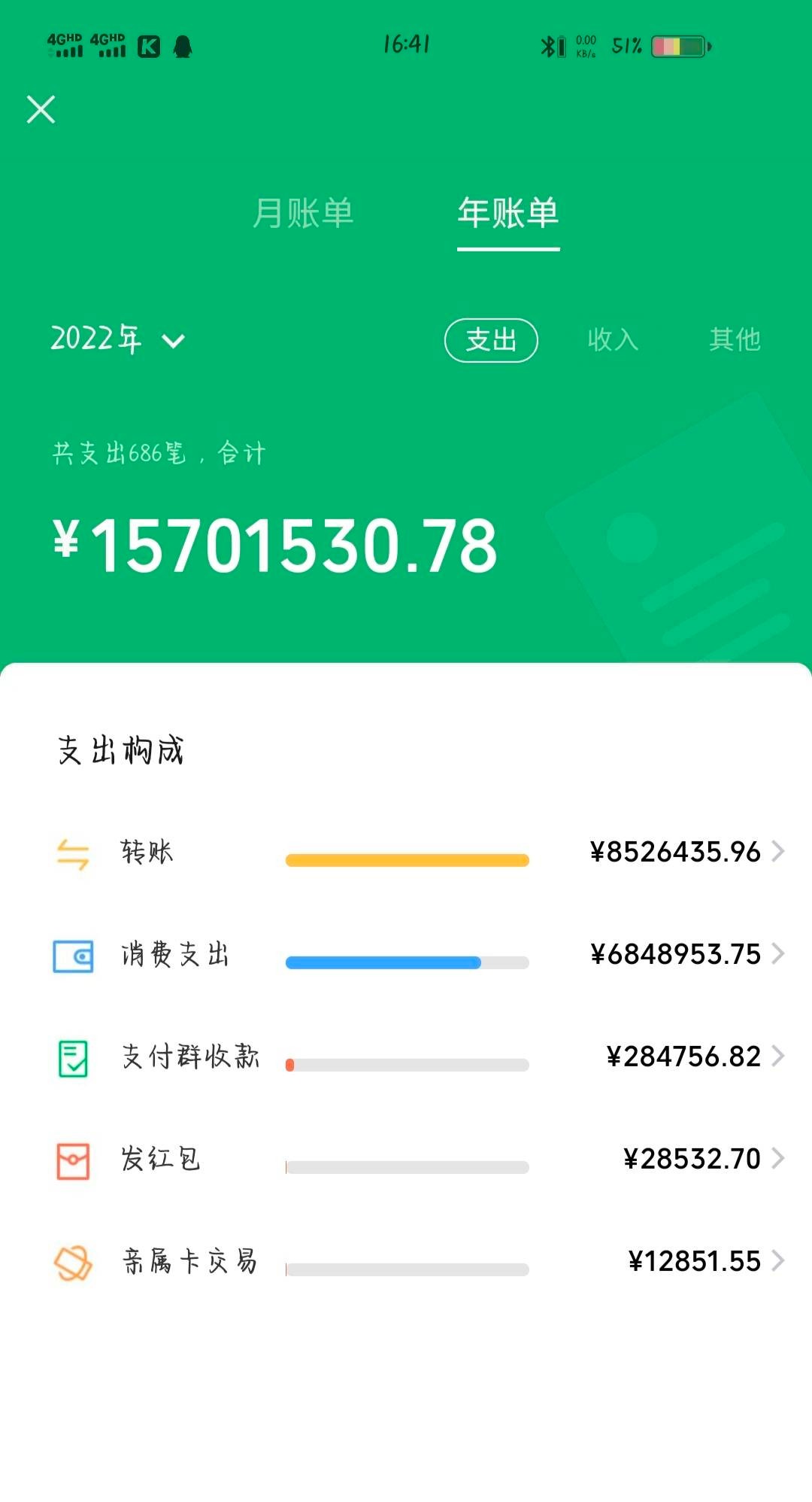 我前几天发帖问哪里有收微信的,这个人说他想要然后加上我了。不过脑子有点不清楚,用两个号加我两个qq,然后头像还是同一个。再然后就是加上了我qq之后,然后给我发了个微信账单,一共22年消费1500万,一共686也就是说没一次消费最低支付2万多。然后这个比还特么给我发了今年的年账单,也是686。哈哈哈哈笑死我,最开始还想骗我让我去淘宝开点他去拍。我没同意然后说又咸鱼结果就跑了哈哈哈哈。给你们看看他发的截图笑死我了。
