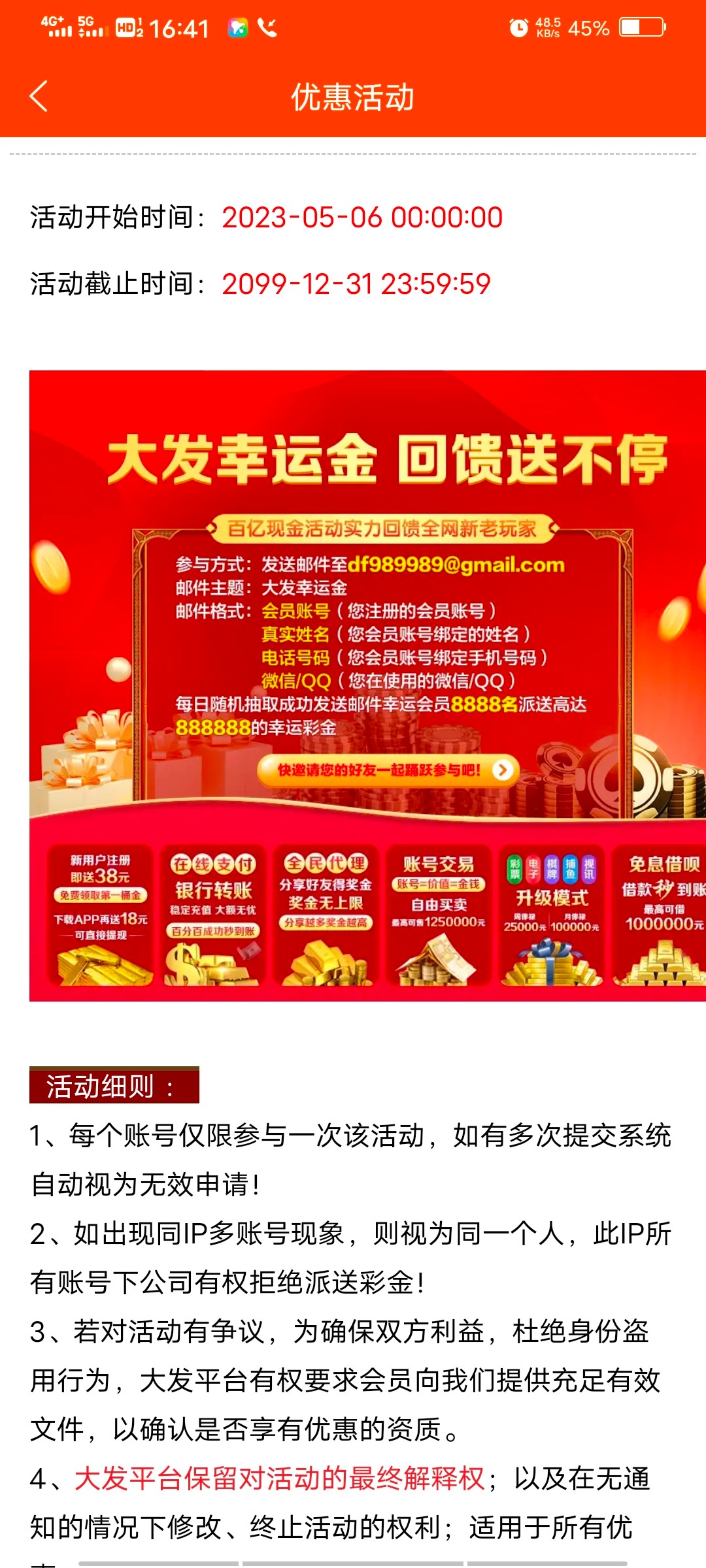注册绑卡领38,下载再送18,发邮件也有彩金
