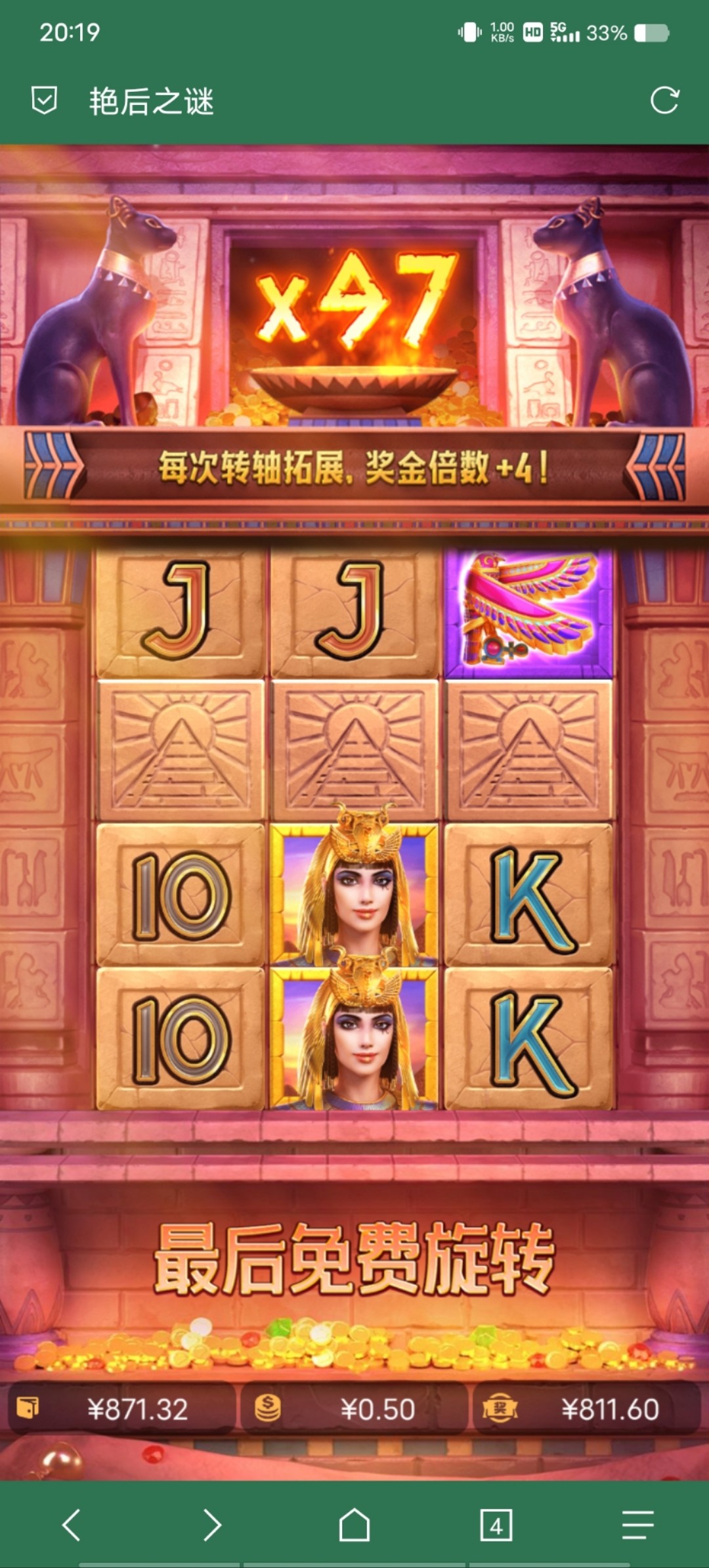 这游戏我一直都是博到最高4x的,第一次给我出免中免,倍数叠到97倍