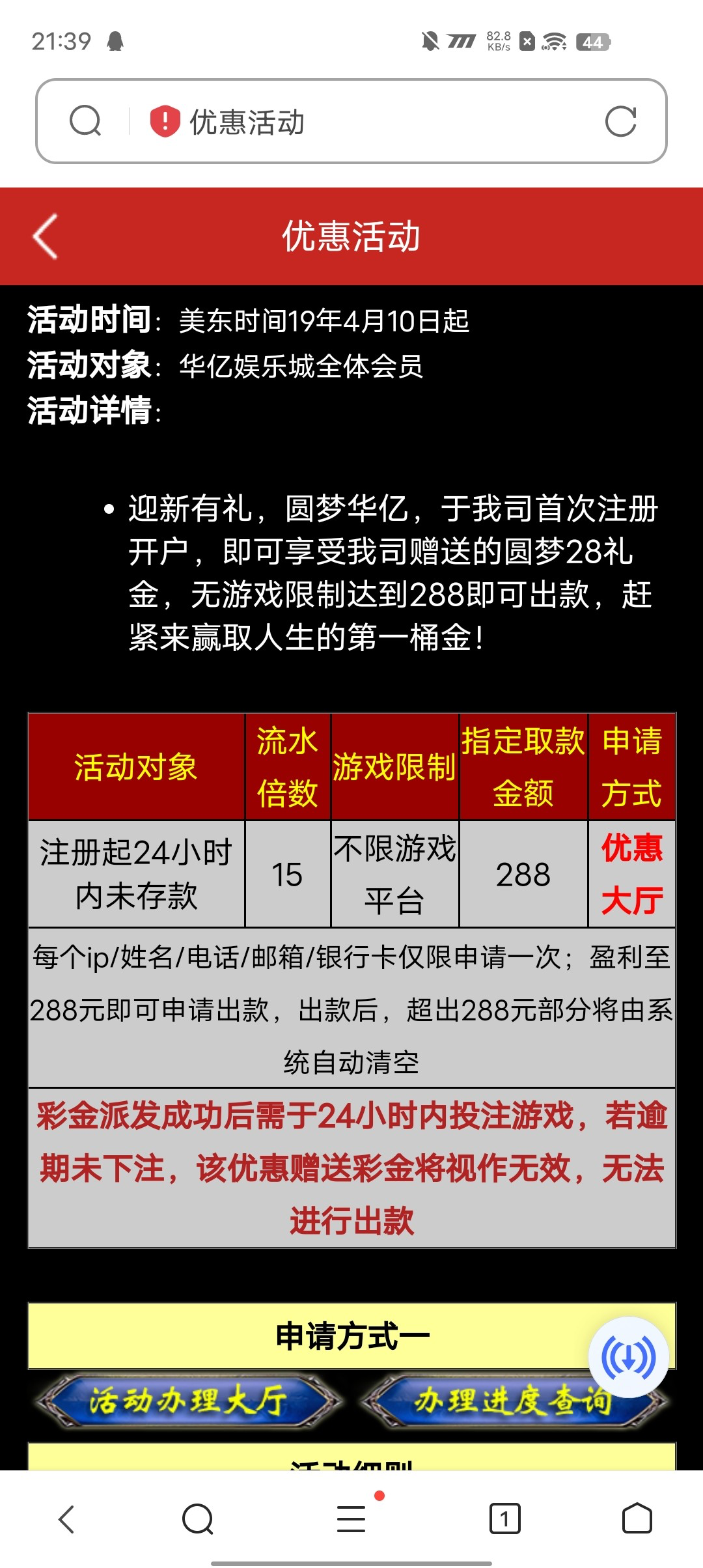 注册完善信息去活动页面进入优惠大厅自助申请15彩金,不限制游戏,只能提288
