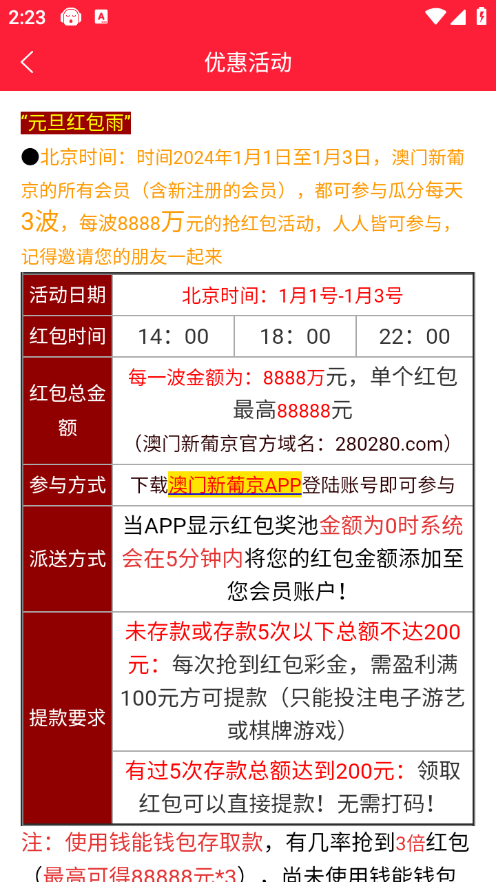 注册绑卡下载APP,活动优惠里面自行申请彩金,2023年12月30日开始元旦3倍红包,每天3-4次,1号当天凌晨可以抢888到990元红包,完全不需要充值,每天还有免费红包抢,新人注册都有下载APP注册彩金送!!冲啊!!!