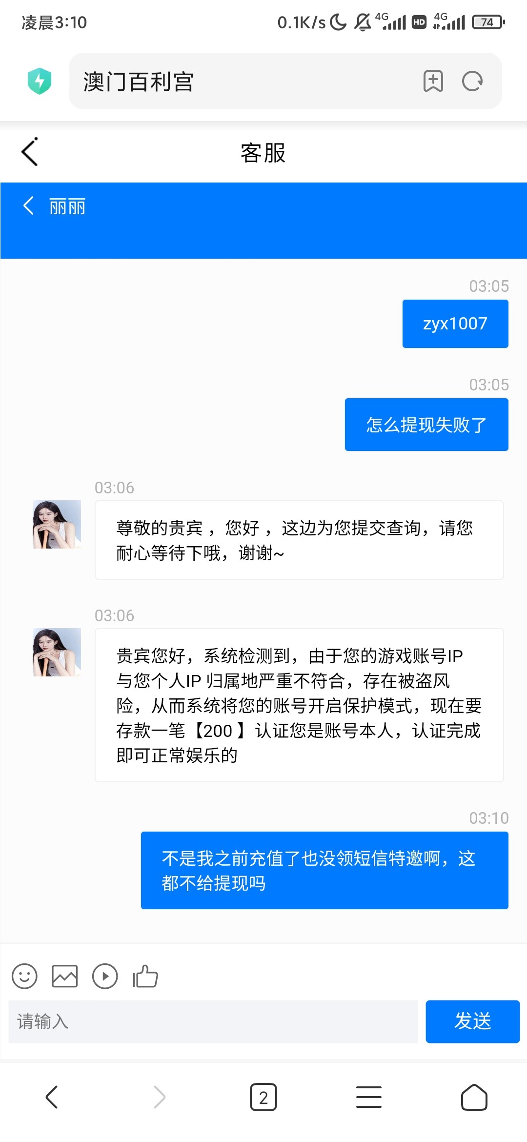 短信特邀都没给我彩金,充了100,打到300不给出,让我再充200当我傻逼呢