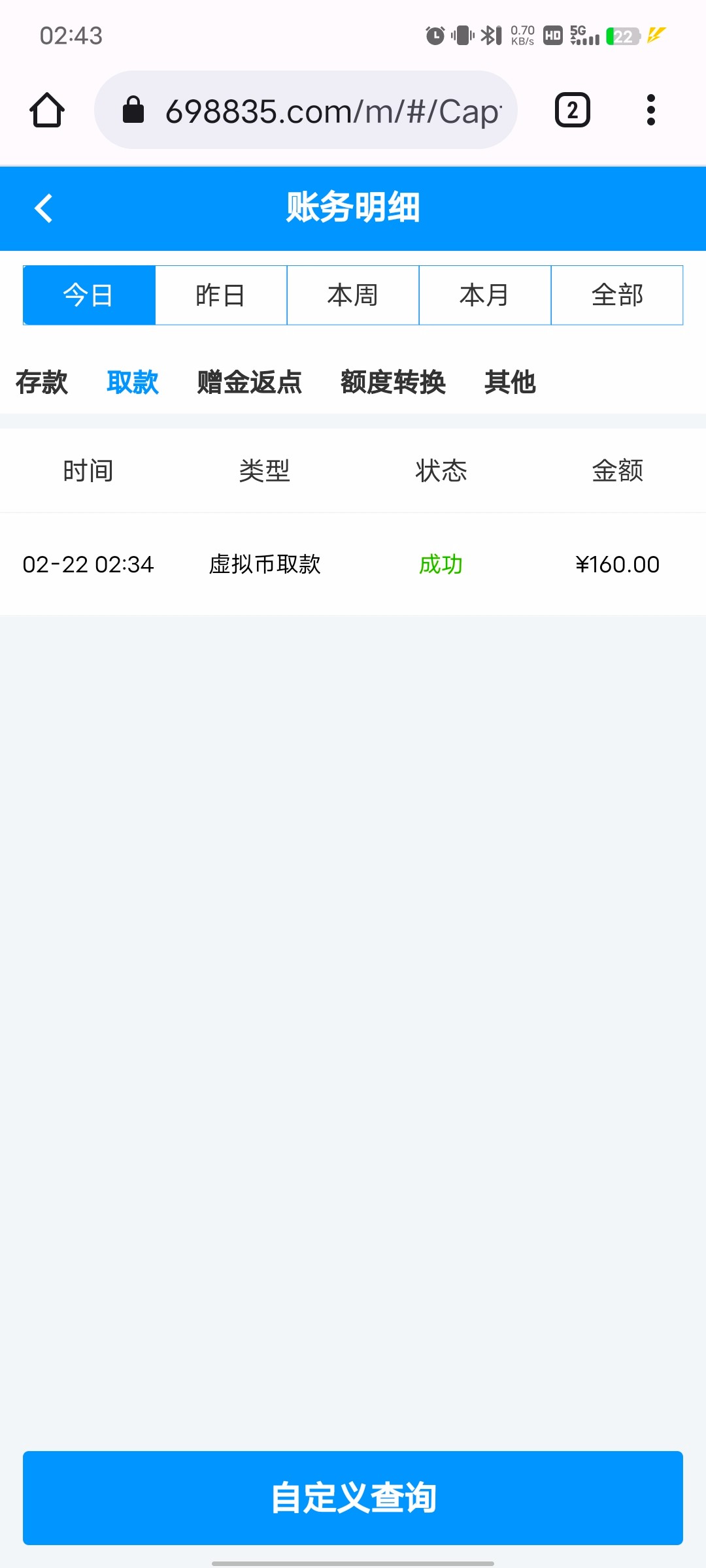 看老哥发的签到台,准备注册,结果一看自己有号就签到了领了7,打到160提款了,忐忑不安的看了下论坛,果然都说是黑台,说充了也不一定出,再回头一看,麻痹,已经到账了,从来没充值过,是去年注册的,当时应该也是领了签到金,但没打出来,这次直接就出了,真是运气爆棚,老哥们也可以去试下签到,看看能不能出,网址就不发了,搜一下,论坛里有,打到100多就提,能出就出,出不了算逑,反正我打出来了,就想让老哥们也试试。