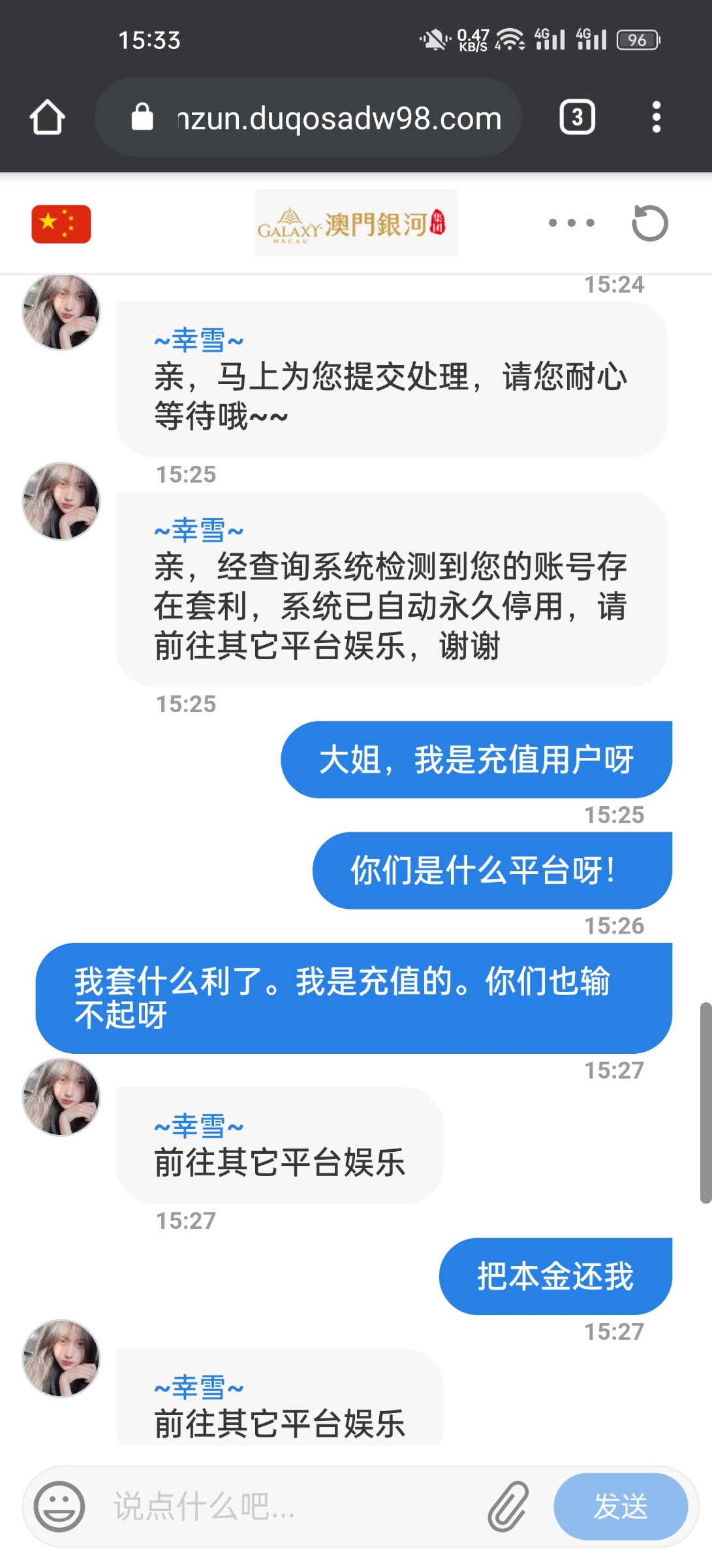 我充值56玩了一下电子没得水就玩了两把彩票取款101被黑,账号也给我停用了。大家注意