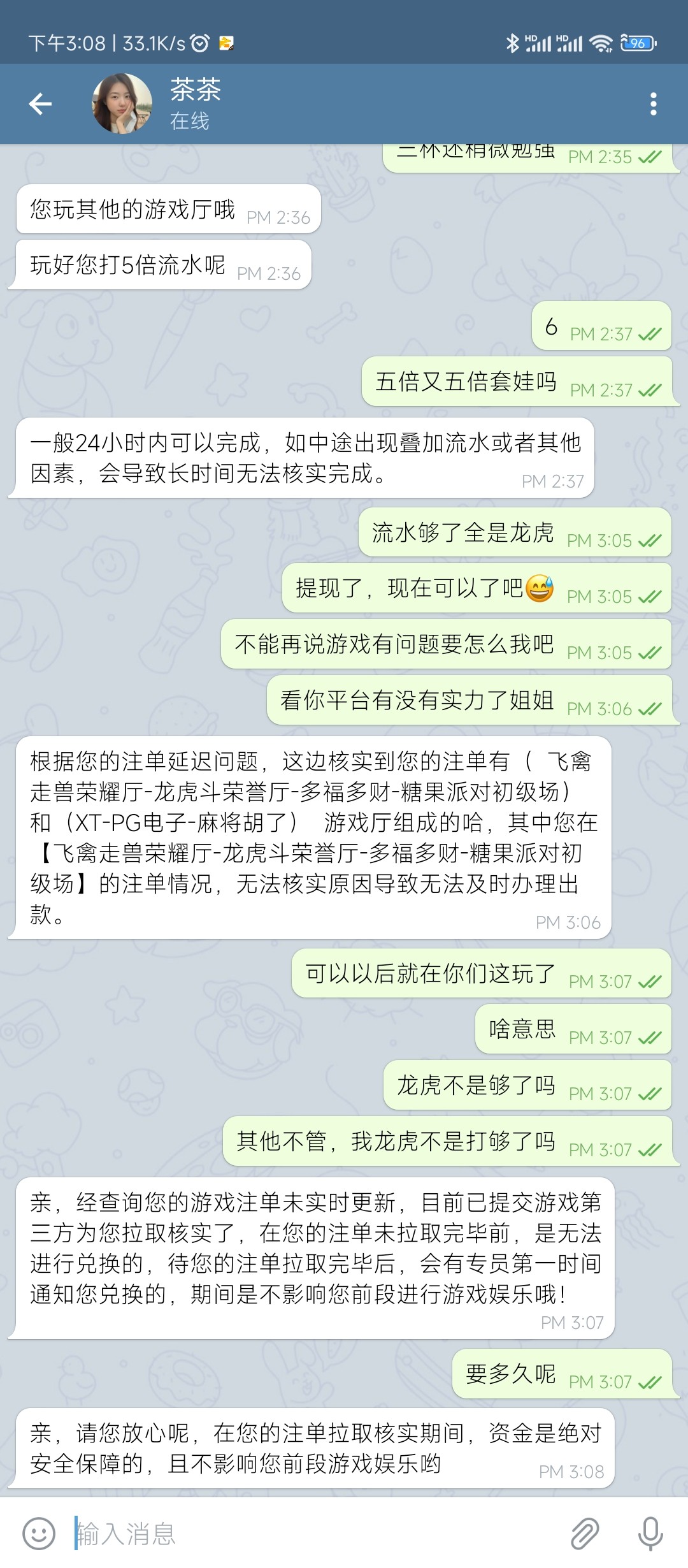 168棋牌电话特邀彩金送8然后一直拉电子嘎嘎爆分,然后赢到1200提现就说注单异常需要五杯水啥的,然后打了他指定的游戏五杯水后还是不行,当欢乐豆了