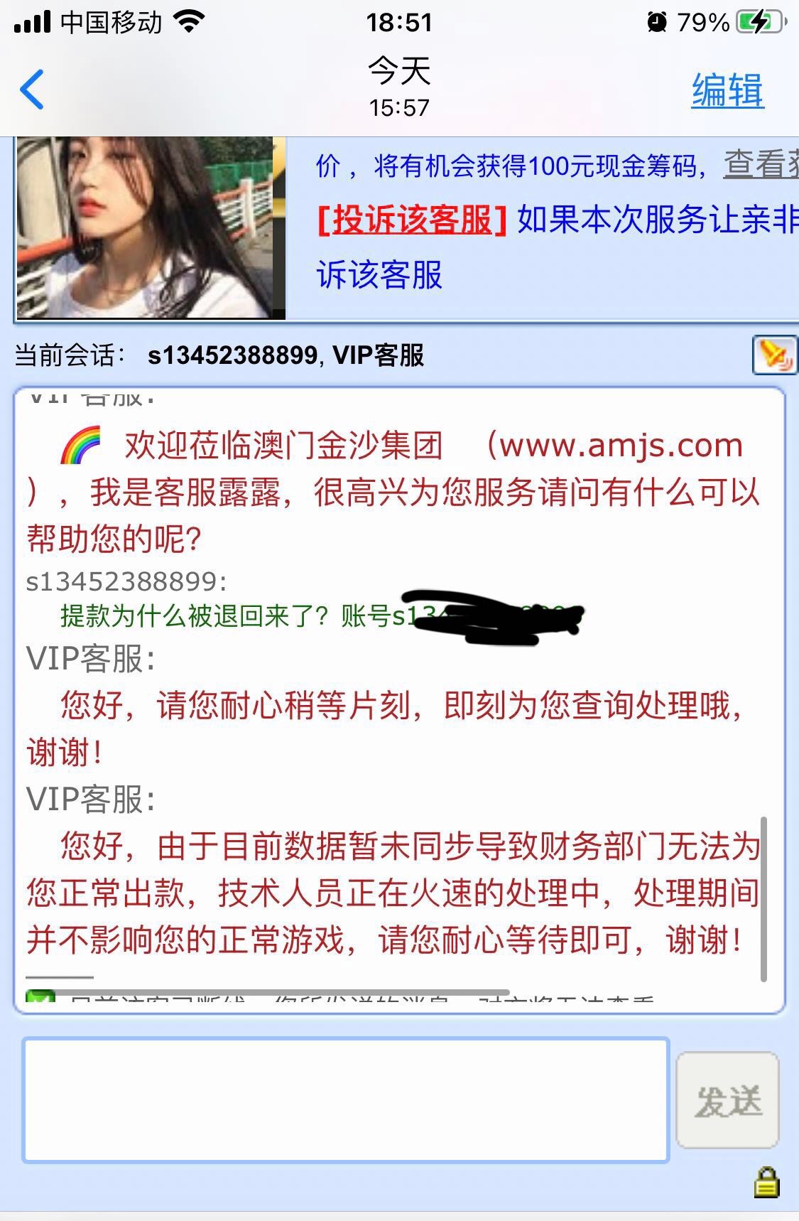 景佳人 黑网,大家千万别去存款!存款100没参加任何优惠,玩电子正常投注娱乐到600提款,一直不出款,提款被退回,找借口说服务器暂未同步导致财务未能出款,问客服具体恢复时间被告知未知。实际是关闭了我账号的出入 ...