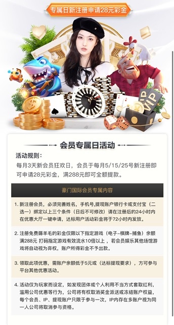 新用户注册下载完善资料,优惠大厅里自助申请28,仅限电子/棋牌/捕鱼,最低288提现。只有每个月的5/15/25号注册的老哥可以申请,其它时间注册的不能申请。审核很久,72小时内派送。