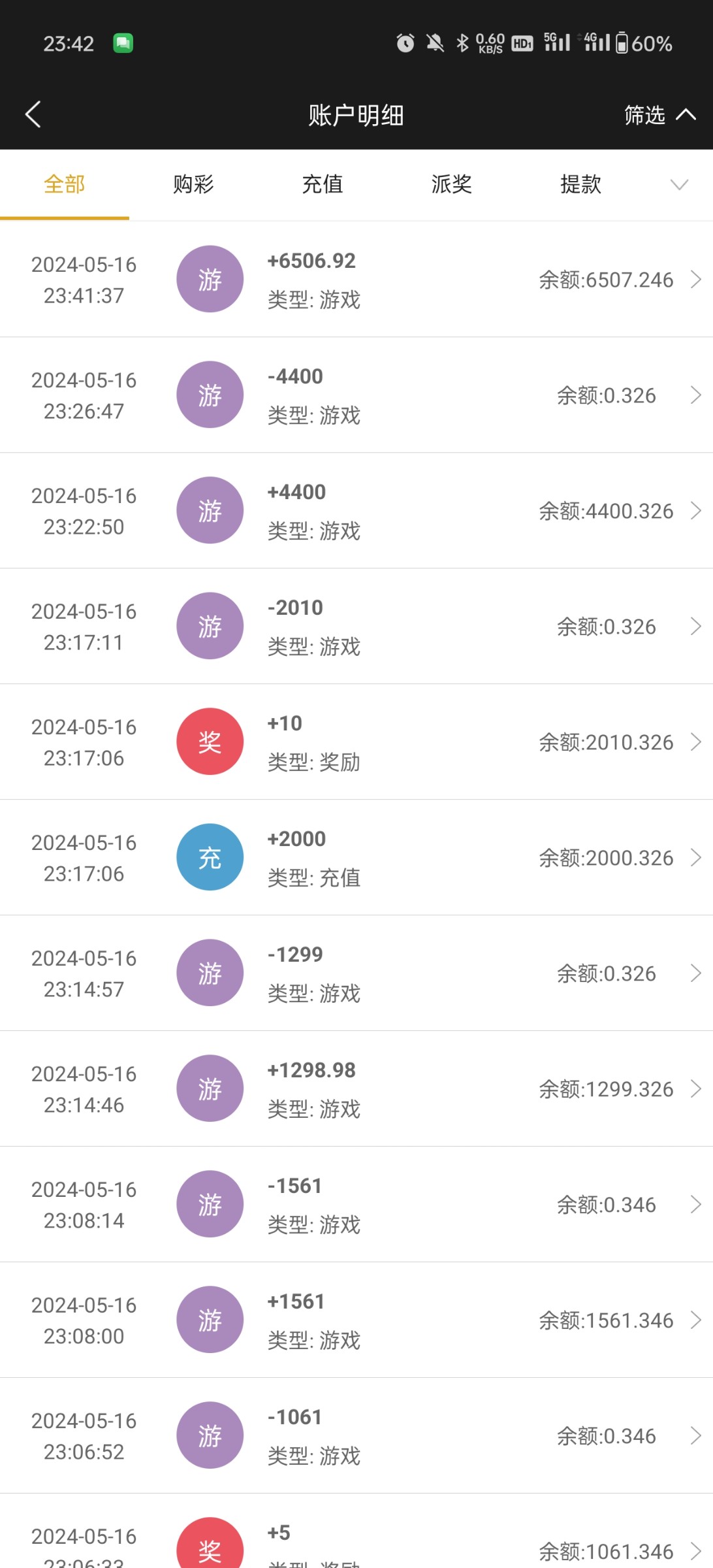 5.15回馈的5块打到3k,输没了,反水25龙虎1关,真人6关,3k,现在干到6500了,提现去了,钱能充充提提,8500了