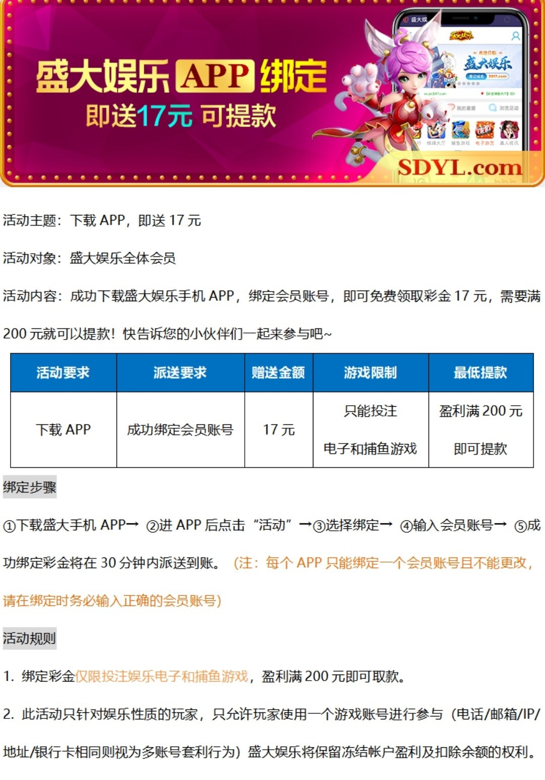 活动:新用户下载注册绑卡下载app送17/200提,限制电子捕鱼,具体看活动。