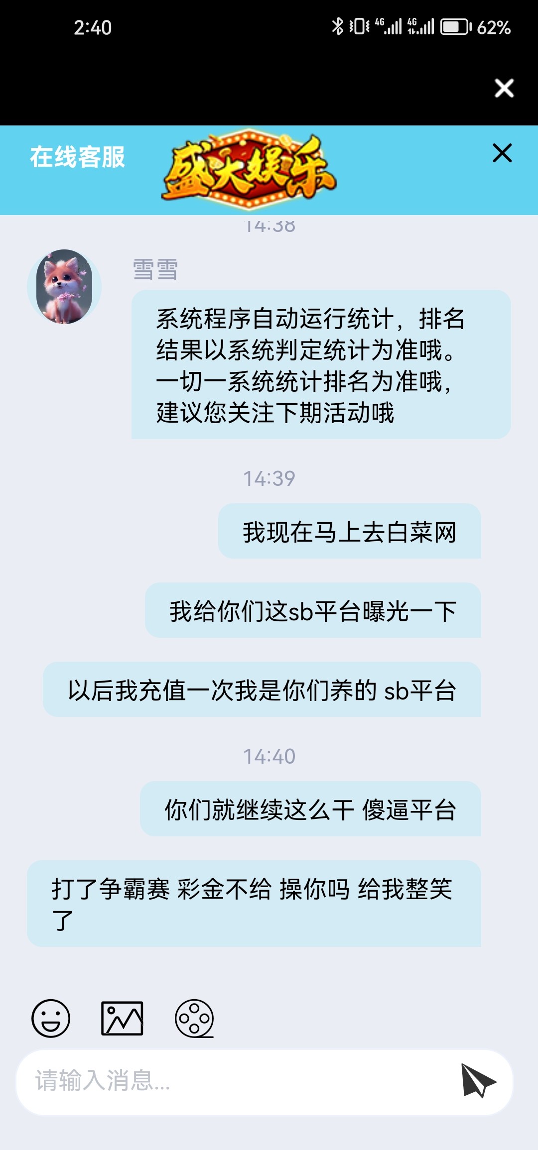 这傻逼平台我天天充值 说我活跃度低 彩金不给 兄弟们避坑 盛大娱乐要黄了