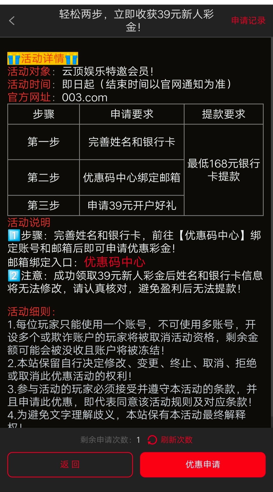 注册绑定信息和邮箱,优惠区自助申请。