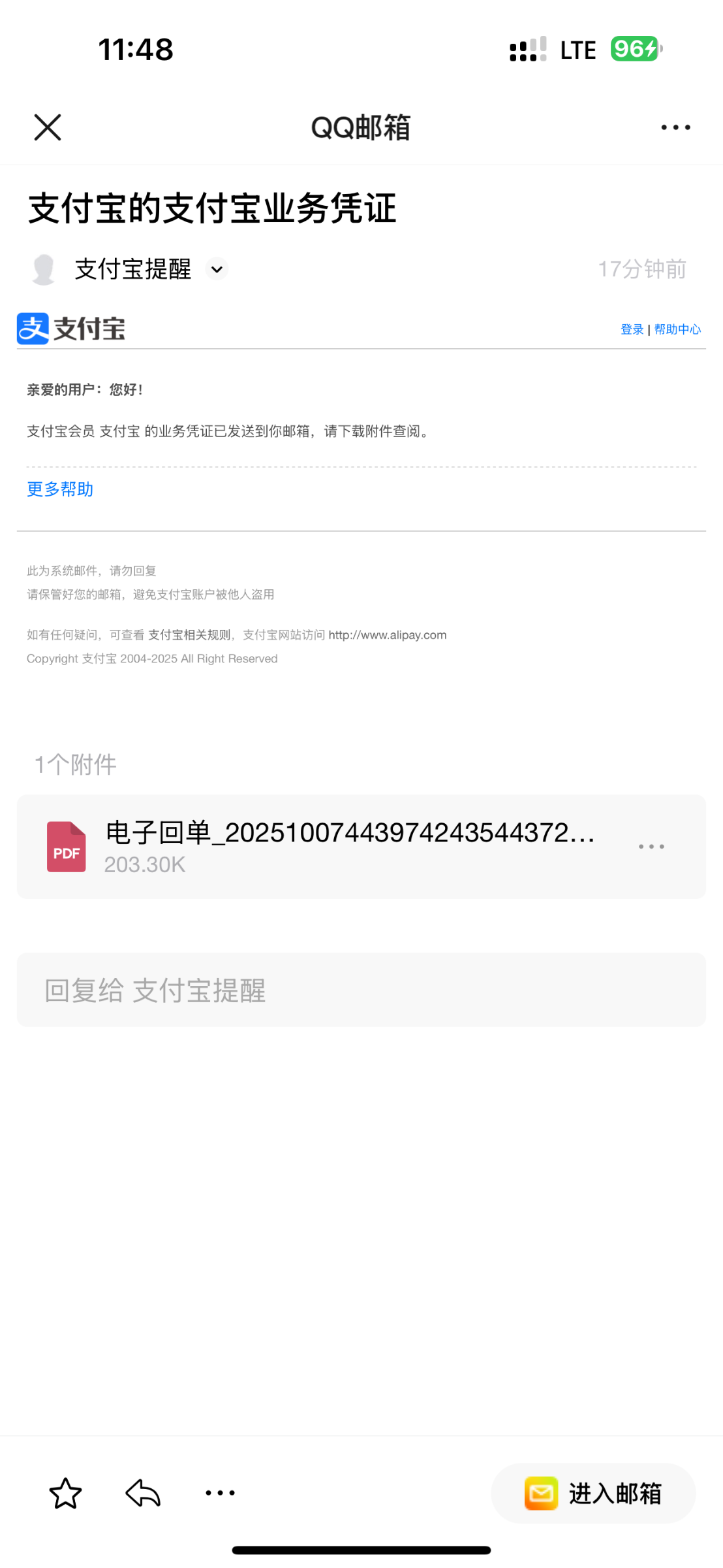 发件邮箱居然是个数字qq邮箱,太假了。搞不到alipay邮箱搞个gmail邮箱也起码糊弄性强一点