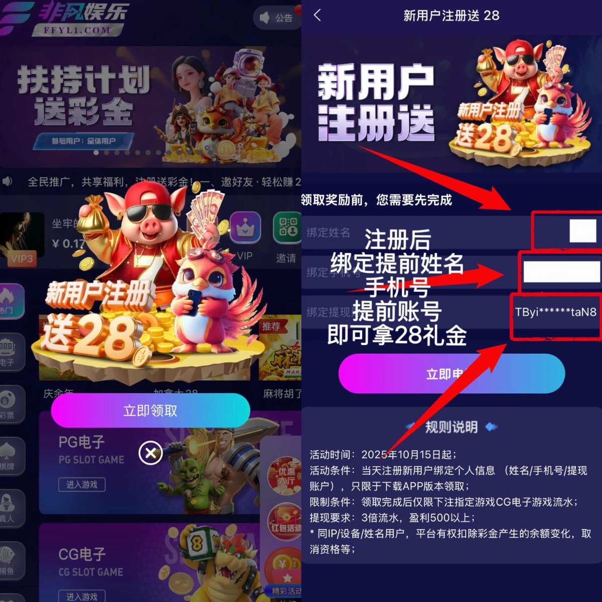 新用户注册后下载app完善资料优惠大厅自助申请28/500提,多账号的别去了包封号,彩金只能玩CG游戏。