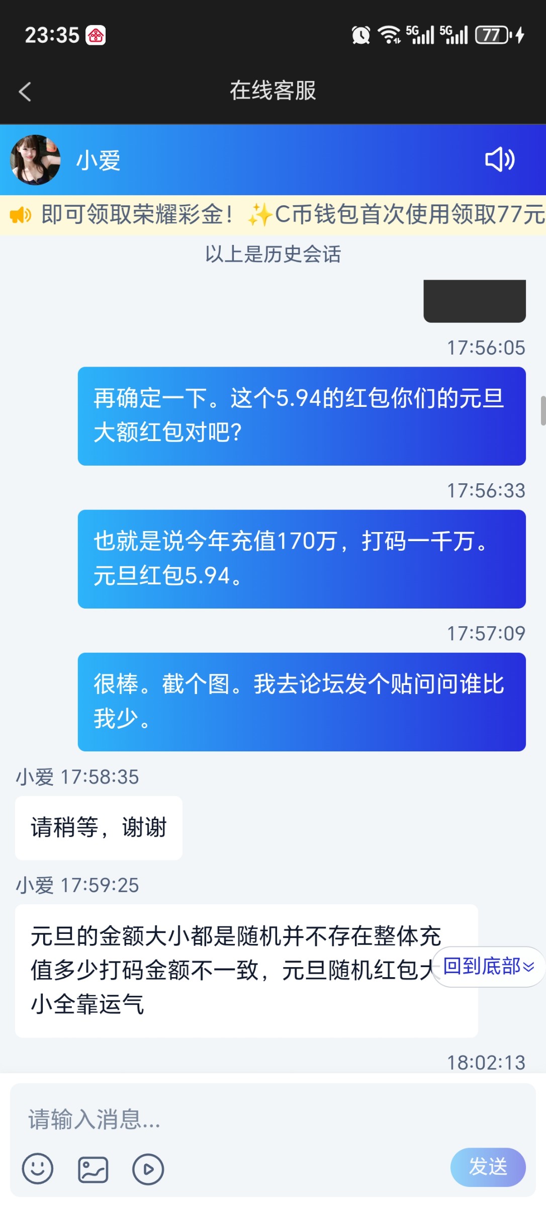 我在3339永利玩了一年,这台格局太大了,今年充了二百多万,元旦给我发了5.94元红包。我真是受宠若惊。这台子格局这么大兄弟们知道么?我真怕他送破产了