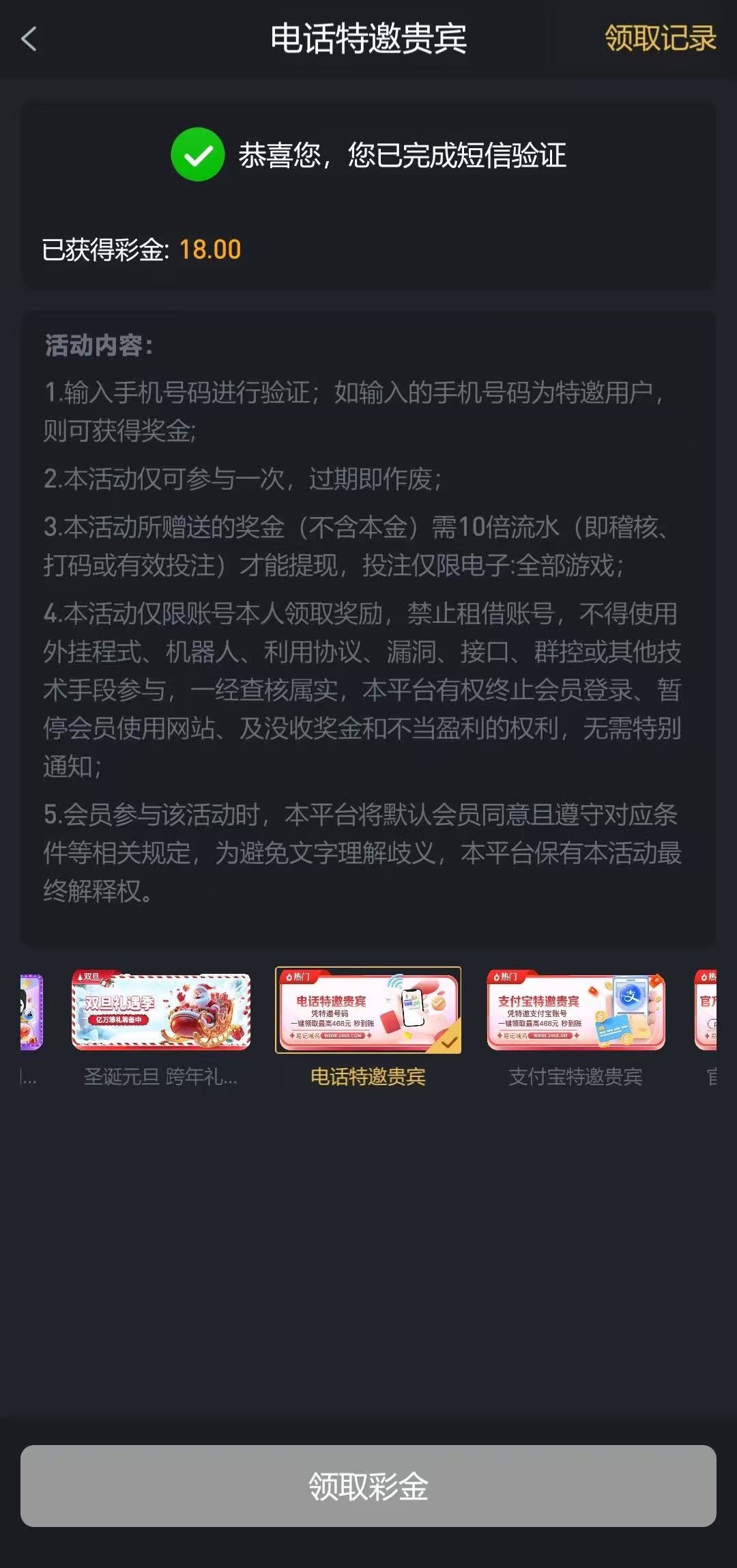 碰瓷特邀,新用户注册绑卡优惠大厅自助认证手机号,是特邀秒送18-46/10倍流水100提,彩金只能玩电子游戏。