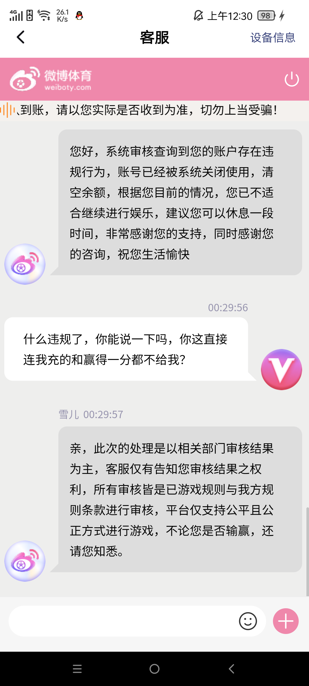 昨天充值450元,玩了几场电竞,还中了一个六合彩提现,800块,平台禁止提现,直接毫无理由的封号,客服装死一直复制粘贴消息,无任何违规操作投注,紧急避坑!