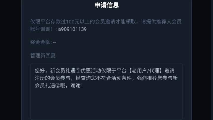 楼主,你账号没有充值过一百,请不要分享出来,每人只能申请一次,你这一个账号发出来又没充值,我们就白白浪费了名额了