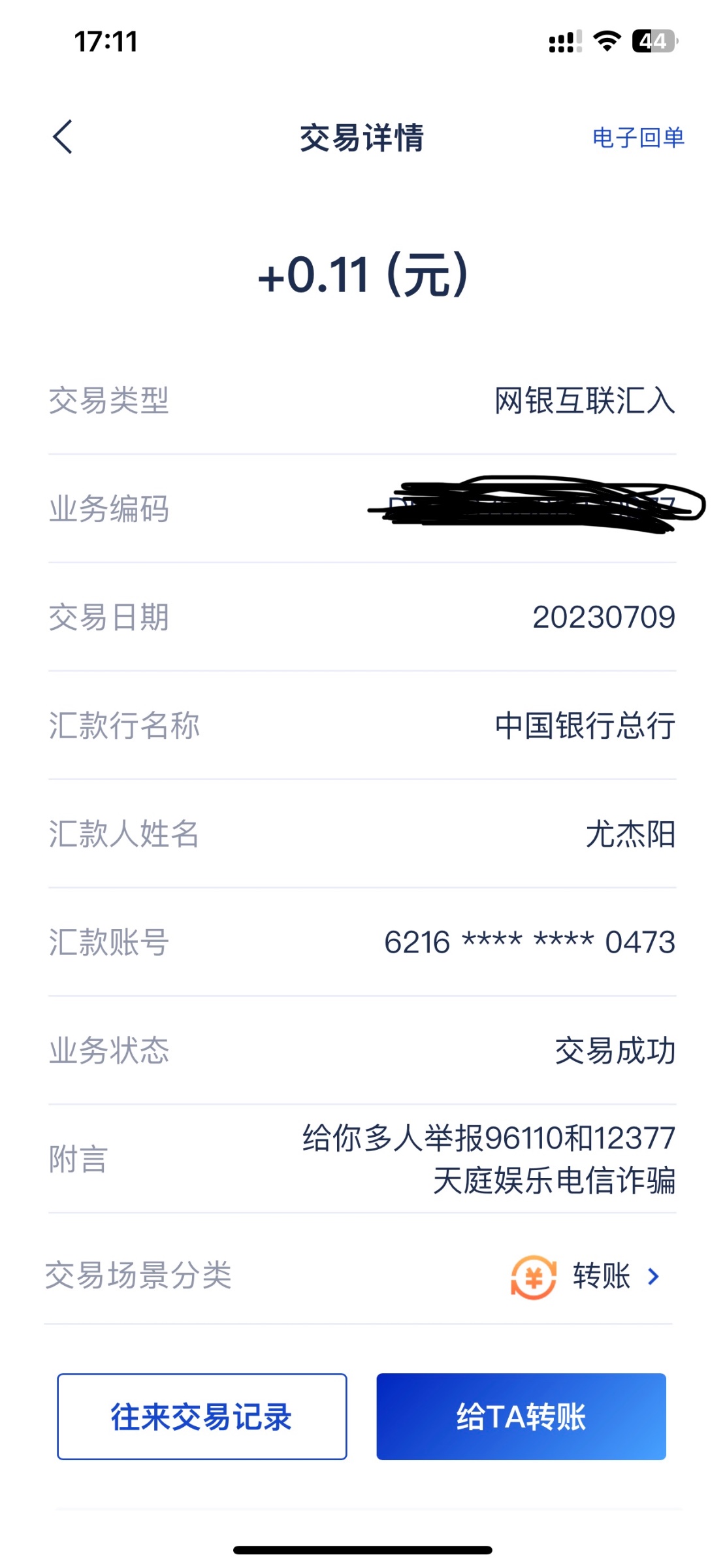 6月27日打比赛奖励打到300提出来,真的衰遇到尤杰阳这个出生给我打款了,顶级这个系列的公司入款就是给玩家出款的,本来我认为这样很好,大概率不会收到黑钱,但是遇到撸公司入款的就很麻烦,遇到尤杰阳这个出生,对顶级系列提卡有点担心,可能有些出生输不起可能去报警什么的,一开始没看到这个出生给我转账附言,我今天才看到,三天给我转0.11、 0.22、1.1、0.11、0.11然后附言,我怕这个出生不死心,所以把卡销户了,电子卡的,我不注销可能也没事,但这个出生每天一两笔转给我,我看着都恶心,因为打比赛奖励只能提卡,不然我提u就可以了,我是在k1提的300,你们看这出生的附言,我之前我在卡农看到一个出生说给顶级系列的卡号转账然后附言,当时我看到它这话觉得特别恶心,没想到现在遇到了,都是玩家的卡号搞这种事真恶心。