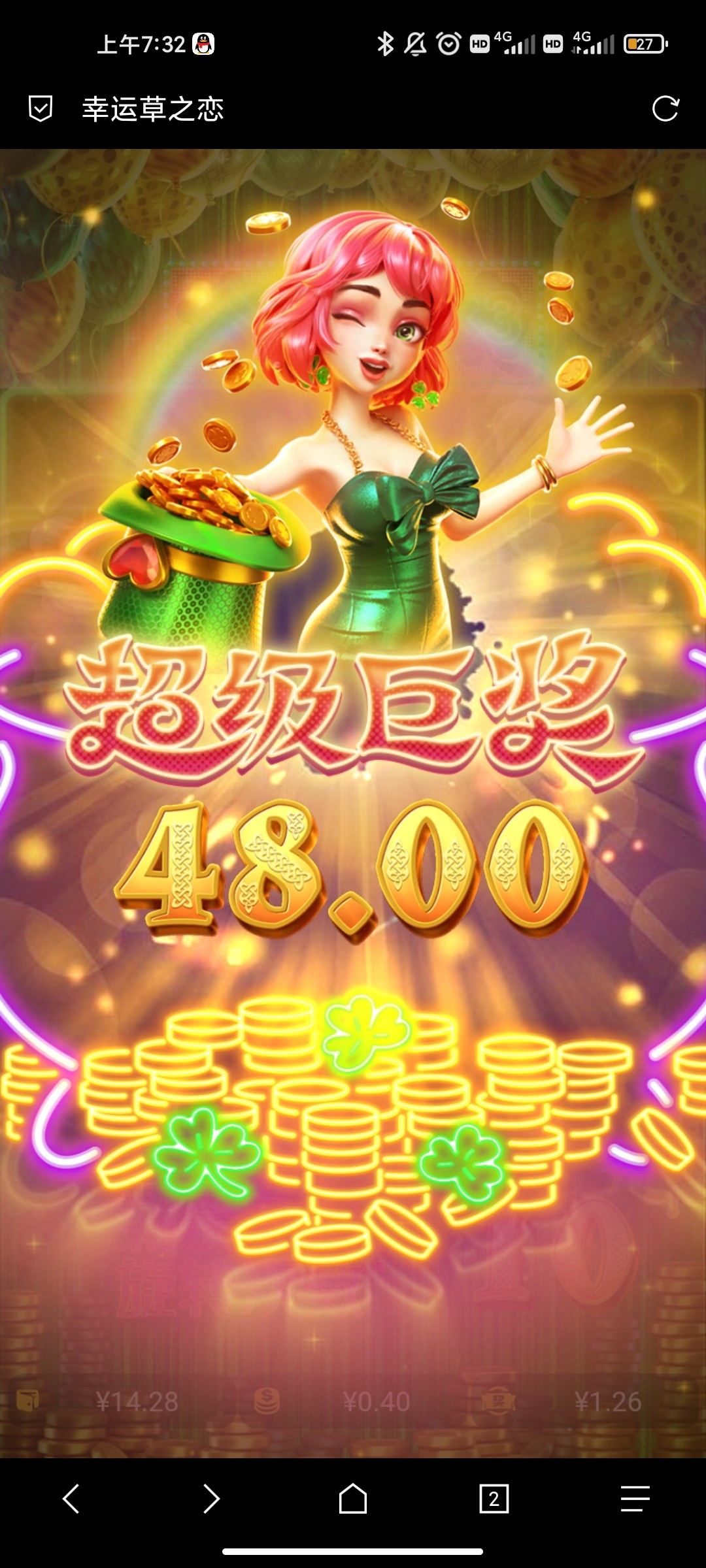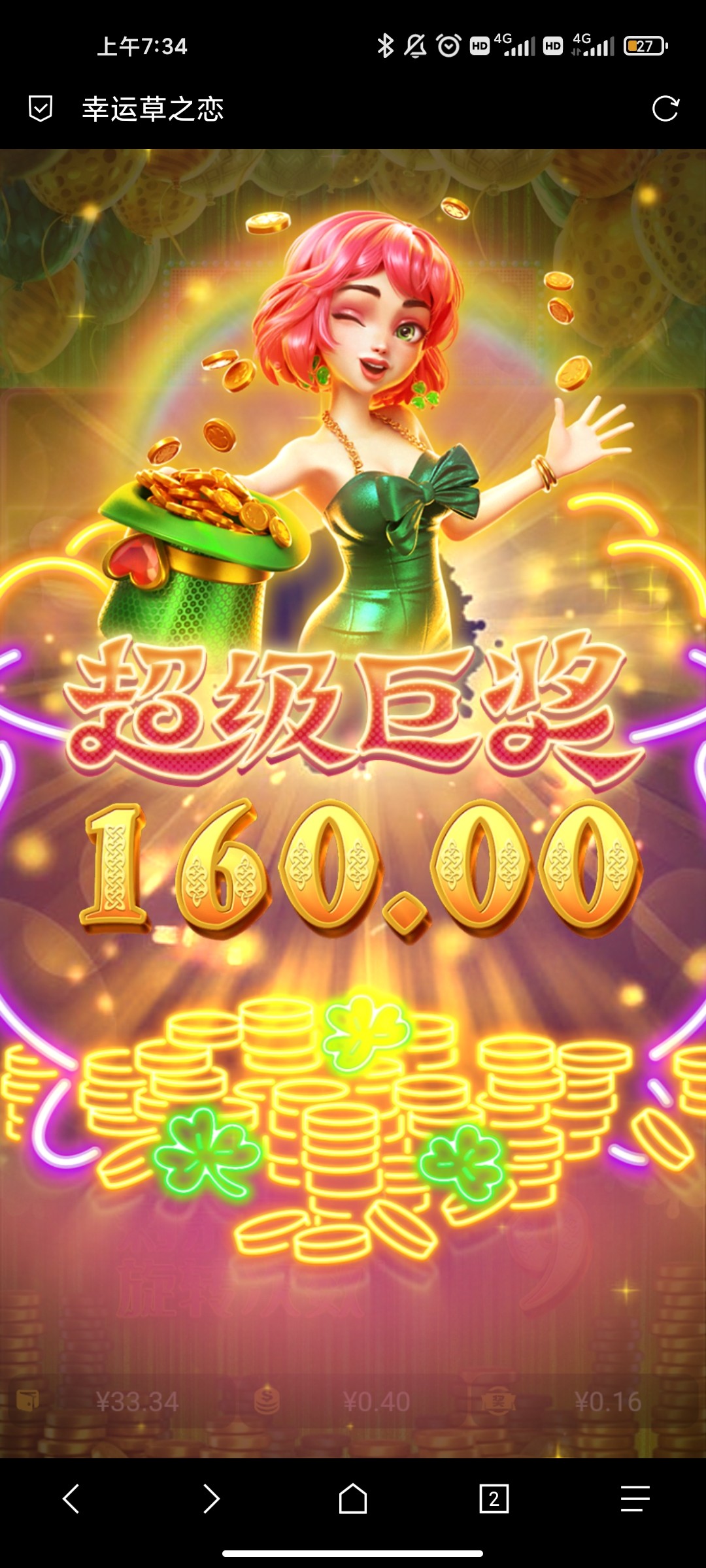 送了18,幸运草大水,拉了几下就进了,爆了40多,买了一手又爆了160,直接提现